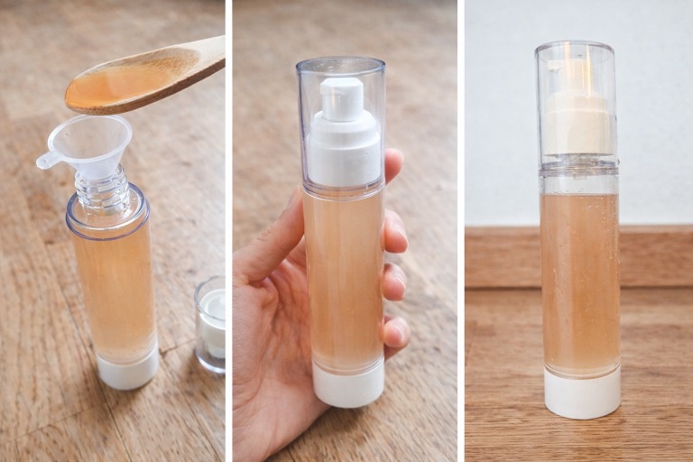 ✓ Als Basis erneut das Aloe Vera Gel, weil es so gut ist. Alternativ, das Pulver mit Wasser vermengen (1 Teil Pulver : ca. 15 Teile Wasser) und einige Minuten quellen lassen, nochmals rühren.